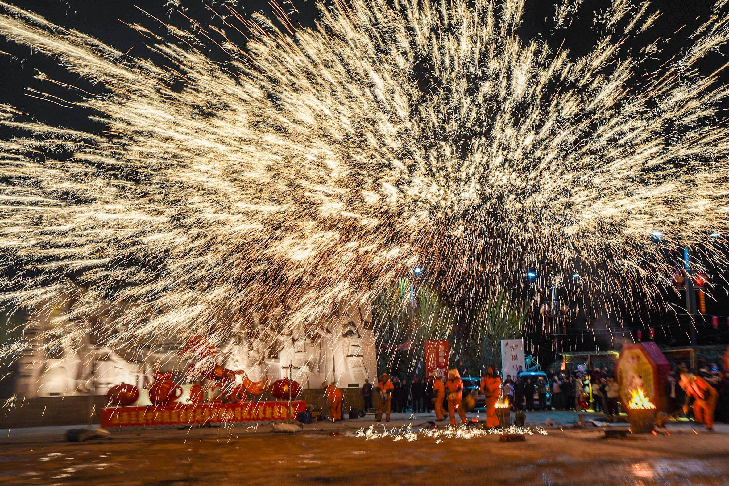 夜幕降临,非遗绝技打铁花、火壶、火流星等登场。铁花飞溅如繁星点点,火壶舞动似火龙盘旋,在夜空绘出“火树银花不夜天”的梦幻景象,与激光秀交相辉映,引得观众阵阵欢呼。