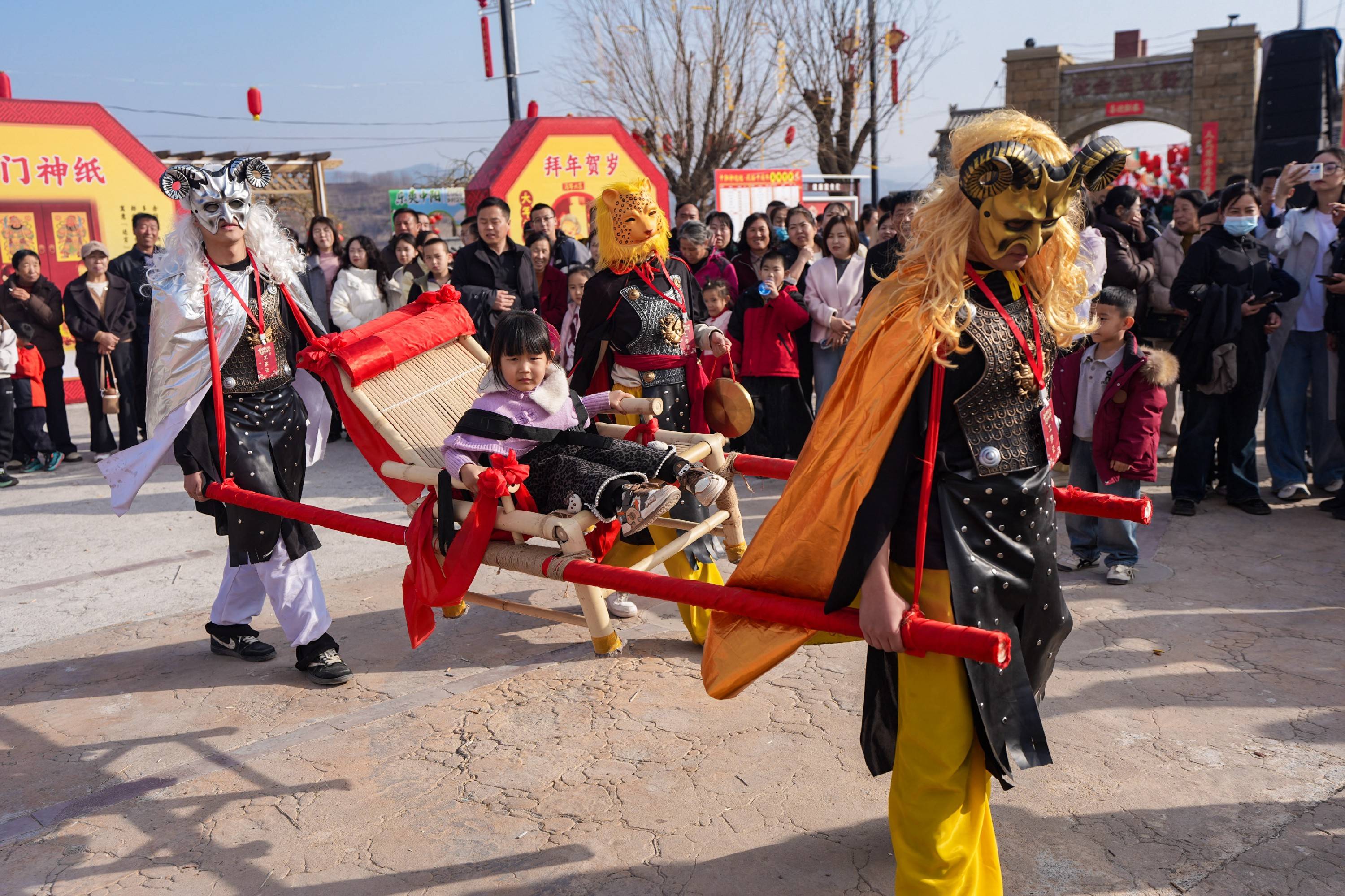 活动期间,从村口至核心景观,每隔数百米便设有表演场地。道路两旁,马形装饰与彩灯灯笼吸引游人驻足拍照。九曲黄河阵前,游客绕阵祈福,祈愿新年顺遂;民俗互动体验区里,游客参与剪纸、写对联、抬轿、耕地等传统农事与年俗活动,在沉浸中感受年俗魅力。